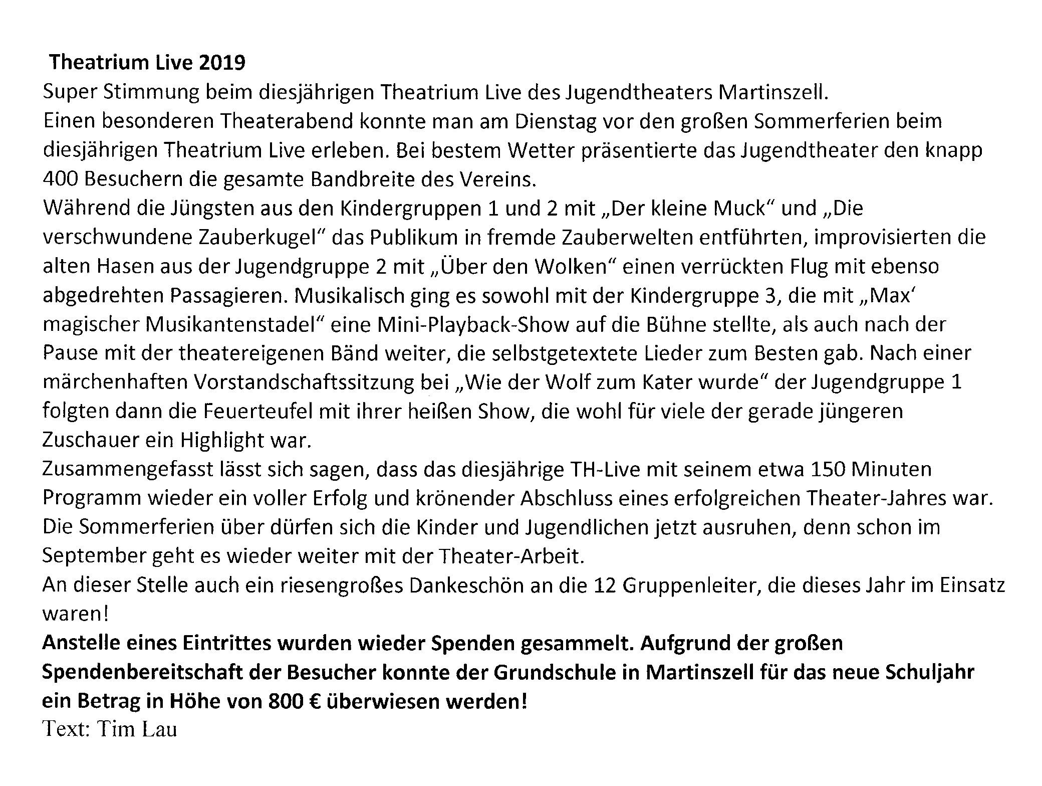 Einen besonderen Theaterabend konnte man am Dienstag vor den großen Sommerferien beim diesjährigen Theatrium Live erleben. Bei bestem Wetter präsentierte das Jugendtheater den knapp 400 Besuchern die gesamte Bandbreite des Vereins.